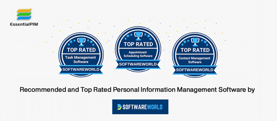 SoftwareWorld, a software review site has listed EsentialPIM in their list of top-rated Personal Information Management Software for its flexible services and data management. They have given 96/100 to EssentialPIM in Task Management Software category for managing work tasks on a great pace. For Contact Management and Appointment Scheduling categories EssentialPIM has earned 95/100 for well-organized workplans and productive synchronization. The acknowledgement of SoftwareWorld verifies the user adaptability and work schedule customization of EssentialPIM. The recognition of SoftwareWorld for Personal Information Management Software upraises the credibility and brand value of EssentialPIM in the tech world.