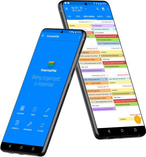 EssentialPIM for Android allows you to keep and manage all your EssentialPIM data on the go. Its main features include the calendar, tasks, notes, contacts, and passwords modules; customizable widgets; automatic synchronization of your data with Google services; the ability to assign tags to items; and storage of attachments linked to any type of item. In addition, EssentialPIM for Android is ad-free and can be directly synchronized with Windows EssentialPIM via Wi-Fi, cellular networks, Bluetooth, or USB cable.